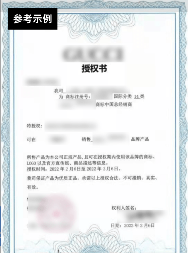 - 品牌授权凭证需包含:授权方、被授权方、授权品牌、授权期限等